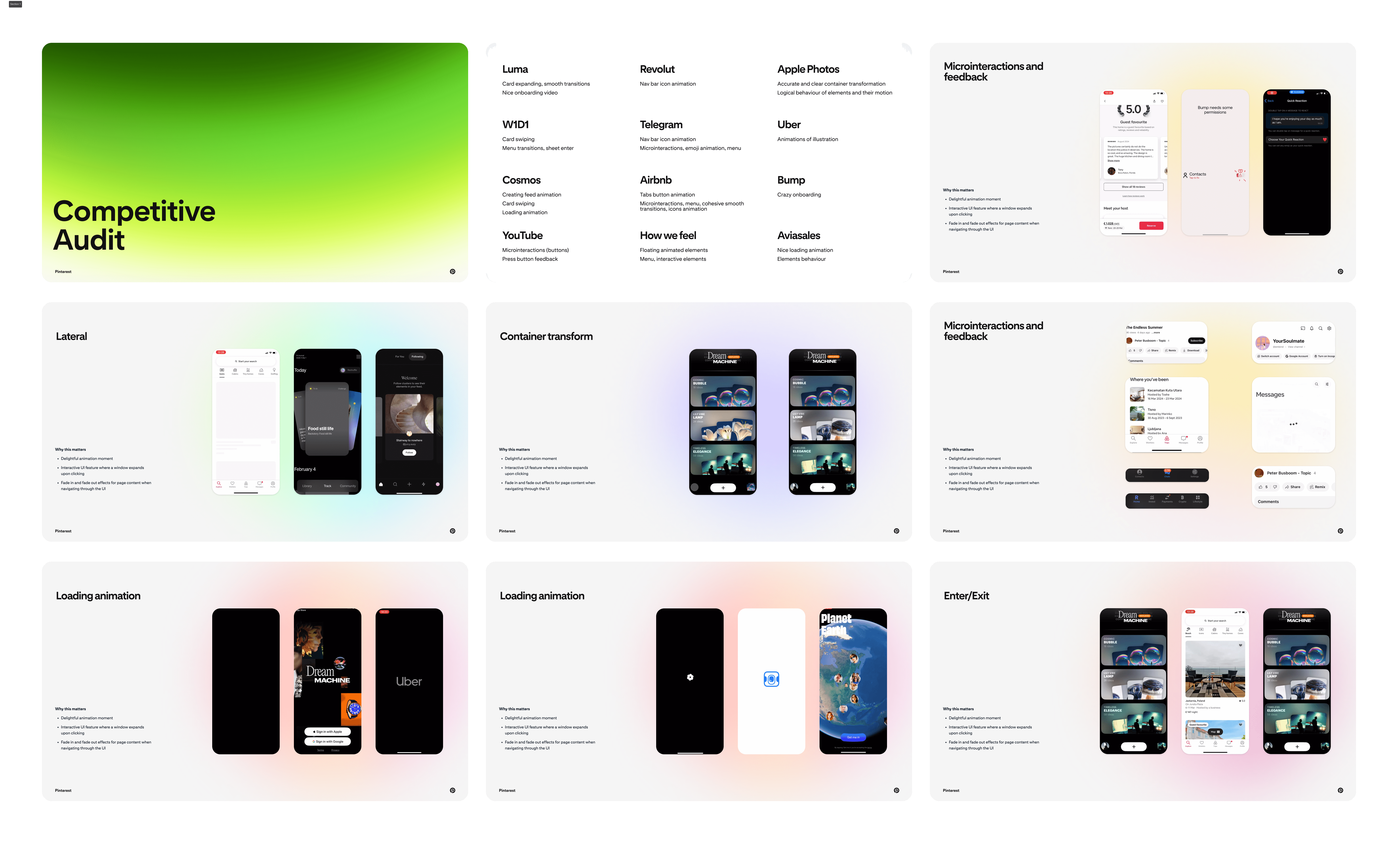 Looking back, I would recommend documenting every single UI element that incorporates motion, not just key transitions. Having a centralized reference would have streamlined future iterations and made it easier to locate specific components during research and implementation.